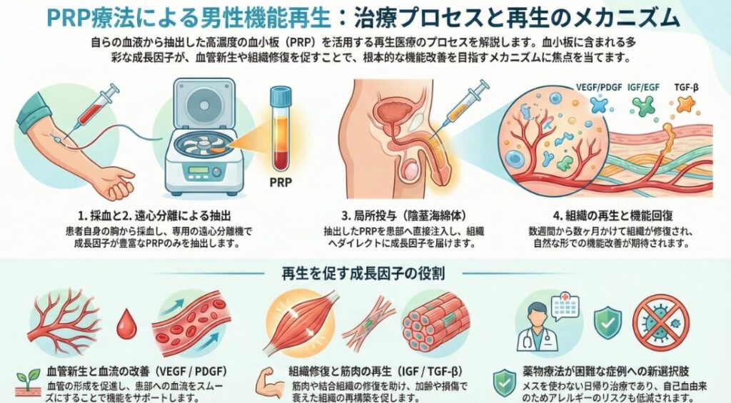ED治療において、従来の薬物療法が適応できない患者や、根本的な改善を目指す患者層に対して、PRPを用いた局所治療が選択肢の一つとして登場しています。自己血由来のPRPを陰茎周辺に投与し、局所環境の改善を目的とした治療として、国内では再生医療等第三種に該当する自由診療として、複数の医療機関で実施されています。