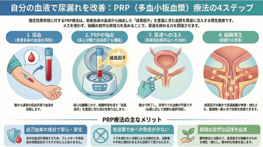 腹圧性尿失禁治療において、手術とリハビリの中間的な位置付けとして、PRP(多血小板血漿)治療が登場しています。手術を希望しない患者層や、既存治療で十分な効果が得られなかった症例を対象に、国内でも導入が始まっています。